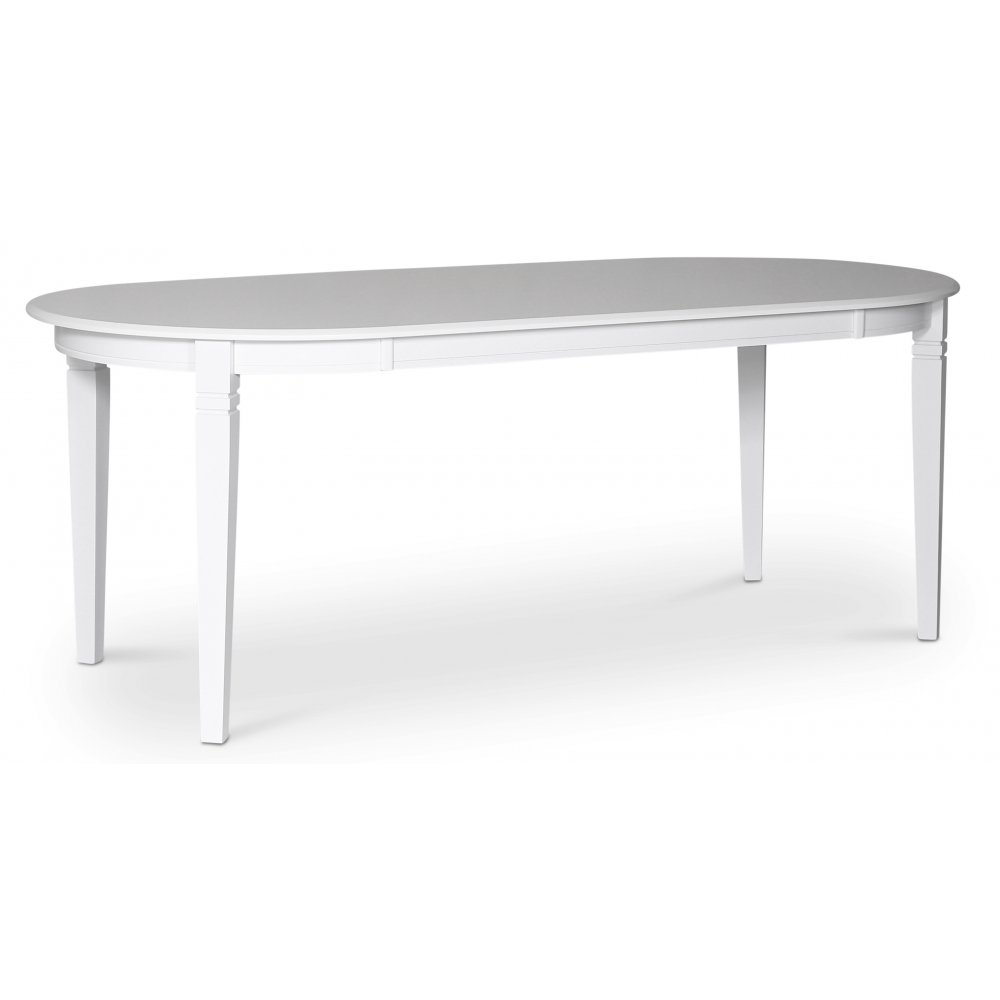 Sandhamn matgrupp Klassiskt utförande. Stilrent Ovalt matbord med vitlackade ben och bordsskiva. Tillsammans med 6 st Sofiero matstolar blir det en perfekt kombination. Stolen med en skön sits klädd i antracitfärgat tyg.