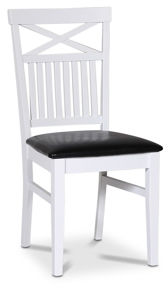 Skagen matgrupp från Skånska Möbelhuset, klassiskt matbord 160/210x90 cm med vitt underrede och en toppskiva i brunoljad ekfanèr. Det ingår 6 stycken matchande Fårö matstolar med kryss i ryggen, vitlackad trästomme med sits i svart PU.