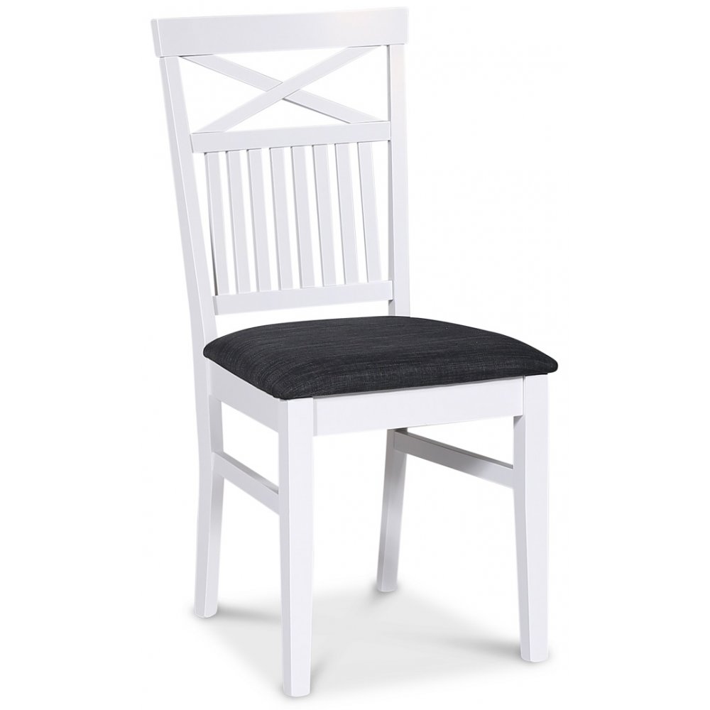 Tromsö matgrupp från Skånska Möbelhuset, klassiskt runt matbord 120 cm i diameter med vitt underrede och en toppskiva i oljad ekfanèr. Det ingår 4 stycken matchande Skagen matstolar i vitlackat trä, kryss i ryggen och sits i grått tyg.