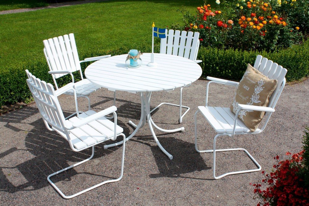 Klassiker som har exklusivt fjäderstål för att ge det rätta gunget. Producerad av högsta kvalitet på stål och trä. Klassisk matgrupp i vitlaserad furu / fjäderstål för uteplatsen, innehåller ett runt bord och 4 st stolar. Passar bra i de skandinaviska miljöerna.